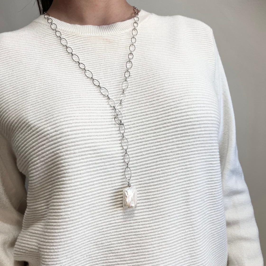 Cadena en acero quirúrgico y una hermosa perla irregular de 25 milímetros.