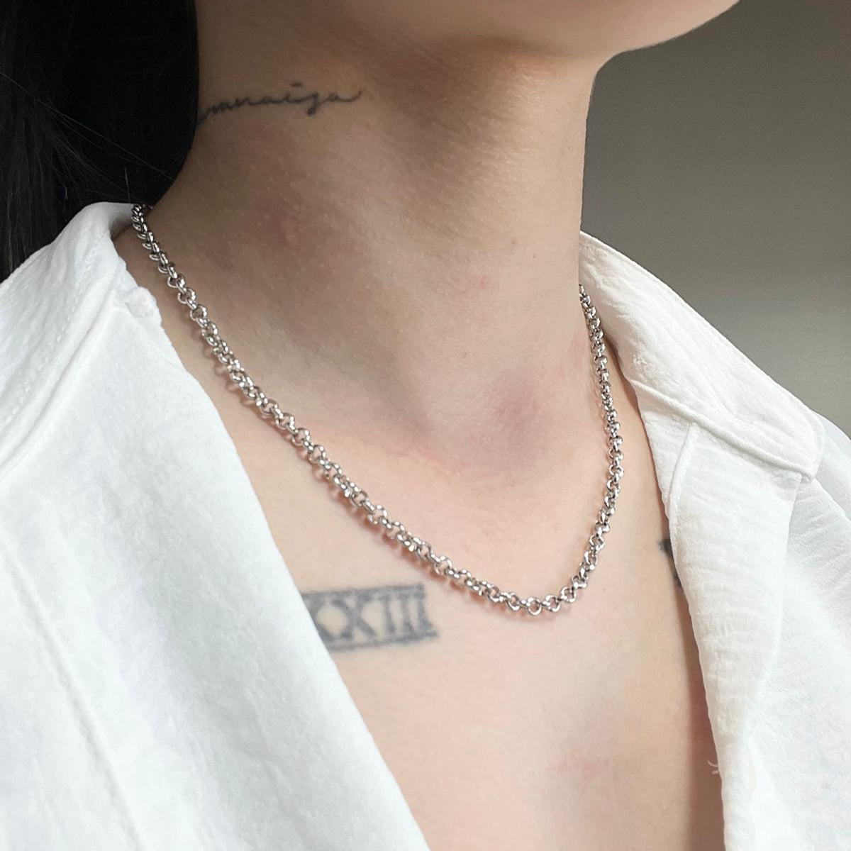 Cadena en material acero quirúrgico, ideal para combinar con más accesorios. Medida de 45 cm