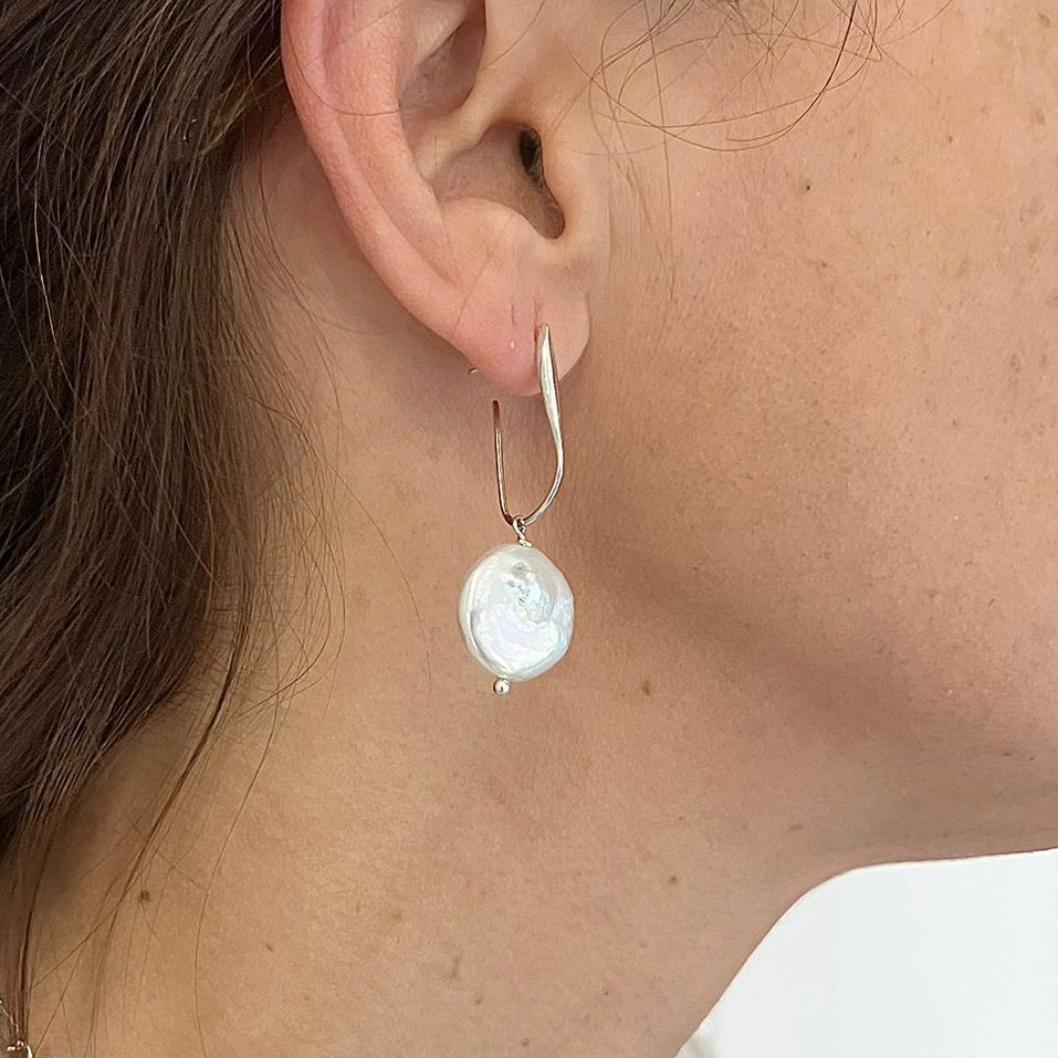 Caravana en material plata 925 y perla de cultivo en forma moneda. Súper livianas y atemporales.